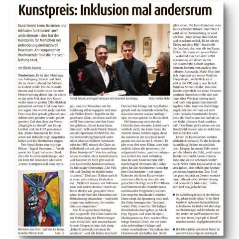 Vielen Dank an „Extra Tipp am Sonntag“ für den herzlichen Bericht! Den Artikel könnt ihr zudem unter diesem Link finden: https://www.extra-tipp-am-sonntag.de/moers-niederrhein/kunstpreis-fuer-menschen-mit-behinderung-inklusion-mal-andersherum_aid-138910673